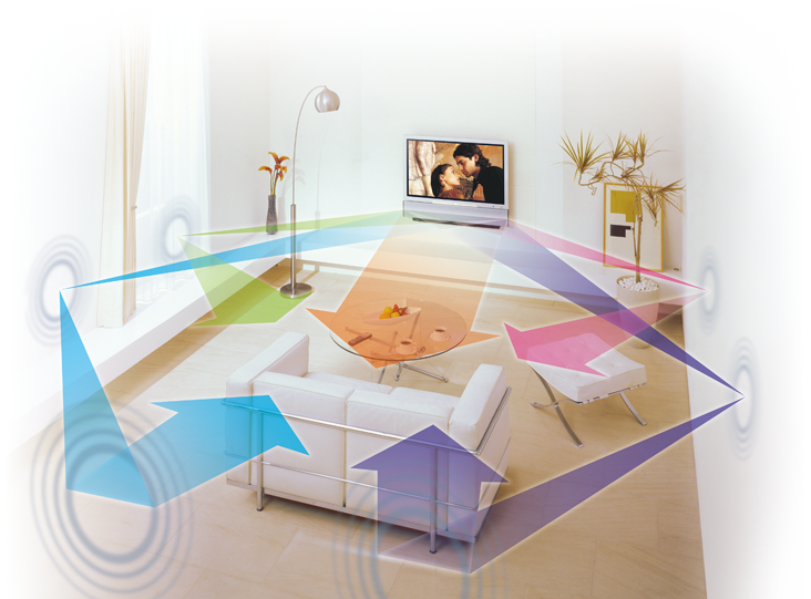 Shifting the timing of the sound from each speaker then generates the capability of orienting the beams. YSP makes use of this principle, precisely controlling five sound beams with highly accurate digital signal control and using the beams’ emission and reflection from wall surfaces to produce a realistic sonic field with sound that truly comes from left, right and behind.