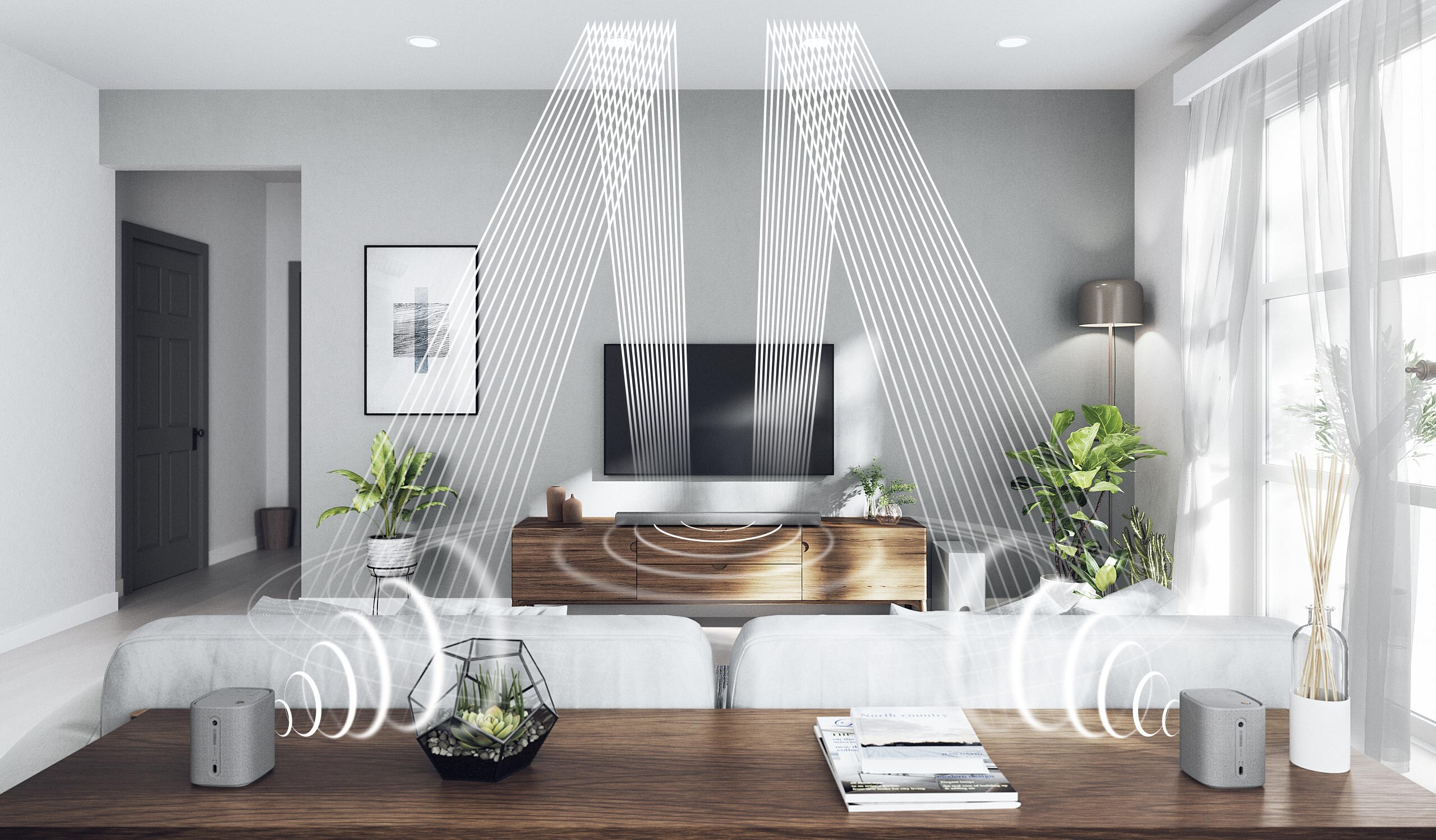 이번 신제품은 야마하 사운드바 중 최상급 제품으로, 몰입감이 한층 업그레이드됐다. TV 측에는 사운드바를, 후면에는 서라운드 스피커를 배치하여 사용하면 공간을 가득 채우는 음장감을 느낄 수 있다. 사운드바 SR-X50A는 돌비 애트모스(Dolby Atmos®) 사운드를 지원해 전·후·좌·우뿐 아니라 상·하까지 전방위로 흐르는 입체적인 사운드를 제공한다.