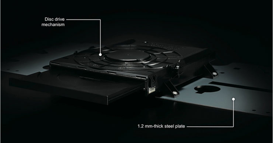 BD-A1060은 고급 알루미늄 전면 패널을 제공합니다. 상단 커버는 0.6mm 두께로 0.6mm 강판을 제공하며, 바닥 섀시 두께는 0.8mm로 1.2mm 강판을 사용합니다. 기존 모델에 비해 높은 안정성을 제공하기 위해 두꺼운 베이스를 사용하여 30% 더 무거워졌습니다. 또한, 드라이브 메커니즘은 1.2mm 두께의 강판으로 섀시에 장착됩니다. 이러한 엄격한 방진 구조로 신호의 열화를 최소화합니다.