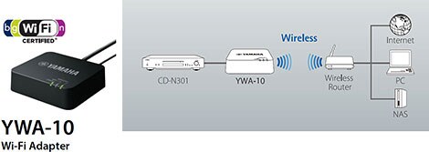 CD-N301은 YWA-10 와이파이 어댑터(옵션 액세서리) 연결을 위한 DC 출력을 제공합니다. 이를 통해 같은 네트워크에 연결된 유무선 공유기를 통해 PC 또는 NAS 등의 음악을 무선으로 스트 리밍 할 수 있습니다. YWA-10은 CD-N301후면에 있는 USB 단 자에 전원을 연결하고, PC를 통해 WPS(자동연결) 또는 수동연 결을 지원합니다.
