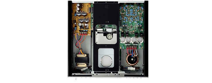 CD-S2100은 완전한 대칭 구조를 제공합니다: 회전로더 메커니즘은 중앙에, 디지털 전원공급 장치 및 회로보드는 왼쪽에 있고, 아날로그 전원공급 장치와 회로기판은 오른쪽에 위치합니다. 완벽하게 분리된 디지털 유닛은 이상적인 중량 밸런스를 제공하면서 아날로그 유닛, 회로 사이의 부정적인 간섭의 영향을 제거합니다. 본체 후면과 5mm(1/4인치) 두께의 알루미늄 전면 패널, 전면으로부터 연장된 센터 프레임은 전체 섀시의 강성을 증가시키고 안정적인 디스크 재생을 보장합니다.