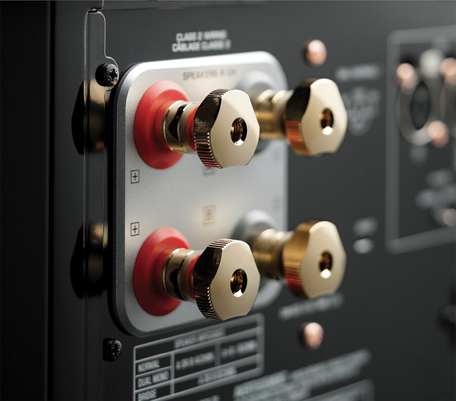 M-5000은 사용하기 쉽고 안전한 연결을 보장하는 대형 나사식 스피커 단자를 사용합니다. 순 황동 블록에서 잘라낸 Yamaha의 독창적 디자인은 디테일과 최고의 품질에 세심한 주의를 기울였습니다.