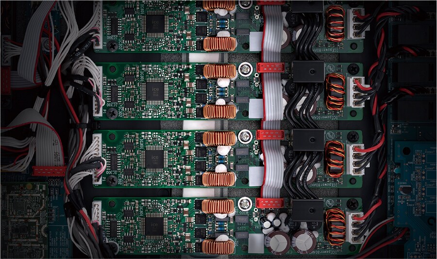 - Eight channels of audiophile-grade Class D amplification assignable to any zone, bridgeable and 4-ohm capable, featuring a unique ground loop/hum-free circuit design