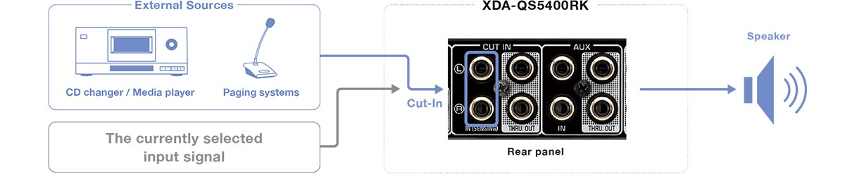In addition to supporting external sources through linking with MusicCast receivers and sound bars, the QS offers an Aux input that can be selected for playback in any zone and a Cut-In input that automatically senses an input signal and temporarily overrides the selected source. This gives you flexibility to integrate media players, CD changers or even paging systems. Thru-Outs let you set up a bus to additional QS units.