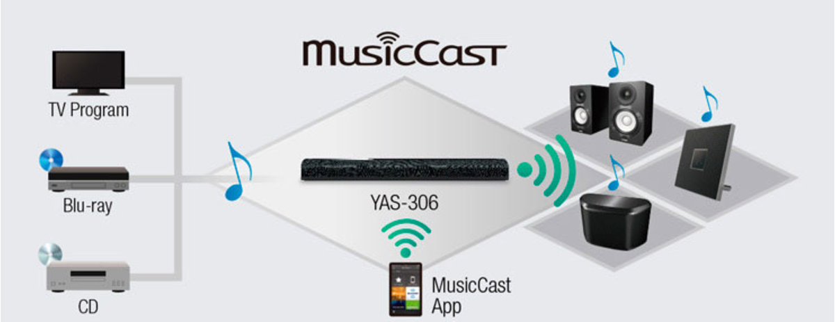 뮤직캐스트는 스마트폰이나 네트워크에 연결된 PC 또는 NAS 의 스트리밍 서비스를 통해 집안 어디서나 자유롭게 좋아하는 음악을 즐길 수 있습니다. 또한, YAS-306에 연결한 TV 또는 BD 플레이어와 같은 외부 장치로부터 음악을 공유 할 수 있으며, 블루투스로 연결된 스마트 폰 또는 태블릿에서 오디오 컨텐츠를 여러 방에 있는 뮤직캐스트 장치로 스트리밍 할 수 있습니다.