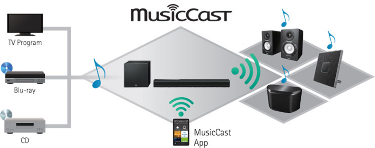뮤직캐스트는 스마트폰이나 네트워크에 연결된 PC 또는 NAS 의 스트리밍 서비스를 통해 집안 어디서나 자유롭게 좋아하는 음악을 즐길 수 있습니다. 또한, YAS-306에 연결한 TV 또는 BD 플레이어와 같은 외부 장치로부터 음악을 공유 할 수 있으며, 블루투스로 연결된 스마트 폰 또는 태블릿에서 오디오 컨텐츠를 여러 방에 있는 뮤직캐스트 장치로 스트리밍 할 수 있습니다.