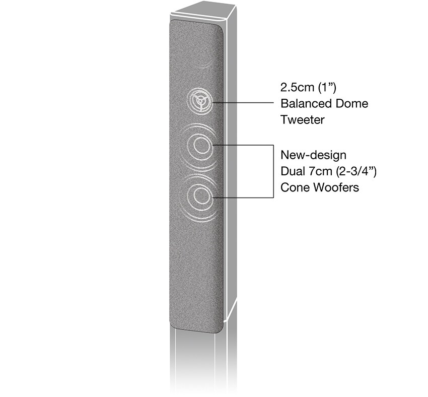 Front speakers are just 90 mm (3-1/2") wide, and with round stands, the front speakers are easy to position in any room. The curvilinear form has the elegant beauty of a fine musical instrument and will add a smart touch to the interior.