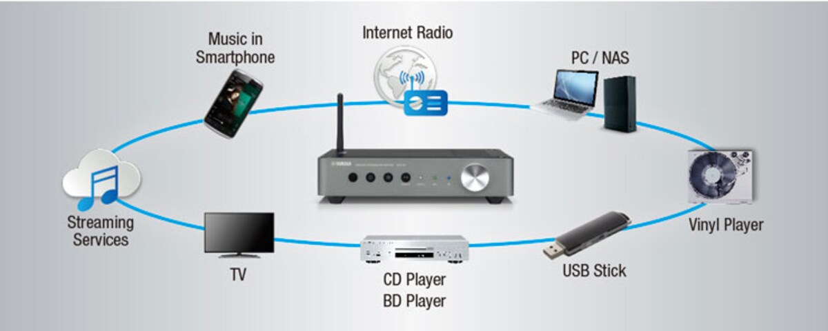 WXC-50은 스트리밍 서비스 같은 모든 형태의 음원 서비스를 지원합니다. TV, CD 플레이어, PC 그리고 다른 AV 기기를 연결하기 위해 다양한 종류의 입력단자를 제공하며, 하나의 기기만으로 전 세계의 음악을 즐길 수 있습니다.