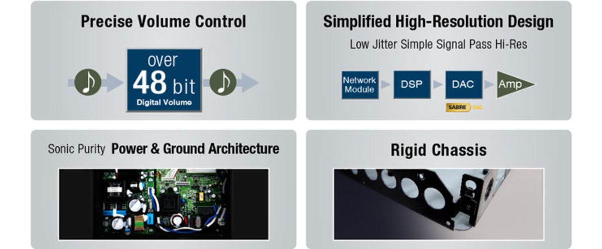 WXC-50은 야마하의 고급 오디오 기술과 회로기술의 장점을 이어받았습니다. 프리앰프 회로는 디지털 지터를 최소화하고 고급 AV 리시버에 사용된 것과 동일한 고성능 ESS DAC를 탑재합니다. 야마하의 독자적인 전원 접지 구성의 퓨어 그라운드 DAC는 전원부에 부정적인 영향이 음질에 영향을 미치지 않도록 합니다. 48비트 디지털 볼륨 제어는 기존 아날로그 또는 디지털 방식에 비해 높은 정밀도를 제공합니다. 또한 고강성 금속 섀시는 강력하고 깨끗한 음악재생에 필요한 안정성을 제공합니다.