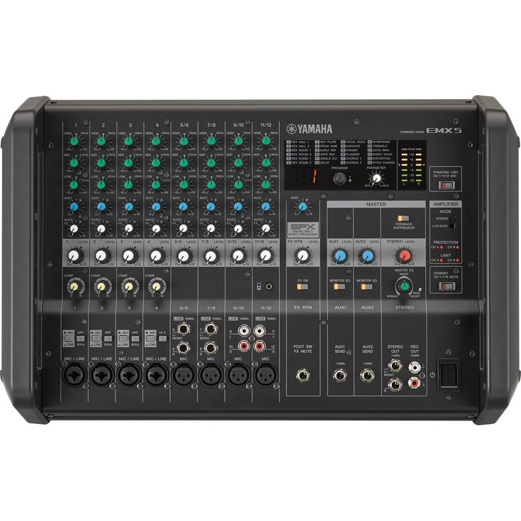 EMX7/5는 Yamaha의 유명한 전문가용 SPX 이펙트 프로세서 시리즈와 동일한 수준의 이펙트 24개를 제공하는 강력하고 폭넓은 DSP 섹션을 갖췄습니다. 콘서트 홀과 작은 클럽 등 다양한 연주 환경의 음향을 시뮬레이션하는 리버브 및 딜레이 이펙트를 추가할 수 있습니다.