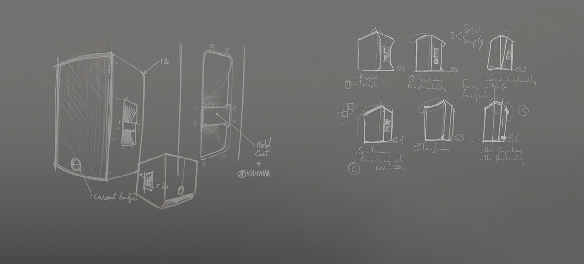 DSR / DXR / DBR 시리즈 스피커를 설계하고 개발한 다음에 분명해진 사실은 간단하지만 유연한 인클로저가 폭넓은 호소력을 가지게되어 결과적으로 사운드 증강 커뮤니티 전체가 광범위하게 받아들일 것이라는 것이었습니다. DZR를 설계할 때, 야마하의 스피커 설계 철학인 단순성은 일관되게 유지하면서 스피커의 높은 출력과 우수한 성능을 미묘하게 표현하는 것이 중요했습니다. 실제로 첫 번째 스케치 디자인 프리젠테이션은 "단순한 솔리드"개념을 중심으로 이루어졌으며, 오랜 시행 착오 과정을 거친 끝에 마침내 사운드 전문가에게 이상적인 라우드스피커에 대한 우리의 비전을 비타협적으로 고려할 수 있었습니다.