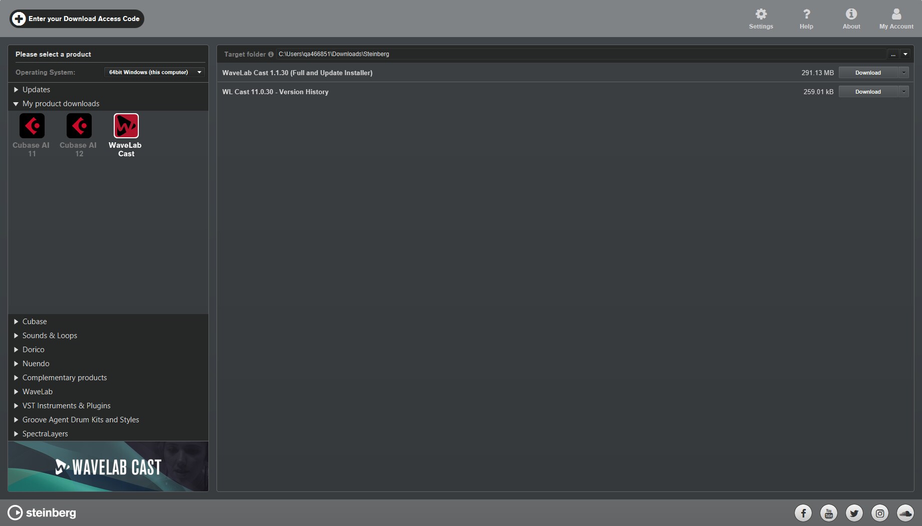 Cubase AI 및 WaveLab Cast를 다운로드 및 활성화하려면 Steinberg Download Assistant를 사용하십시오.