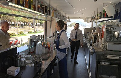 The indoor zones are in the restaurant (VXS3F and HS8S loudspeakers), restaurant kitchen (NS-IC800), bar/takeaway counter (VXS5, VXS10S, NS-IC800, NS-IC400) and the information point (NS-IC800). The outside zones comprise the bar terrace (IP35-rated VXS8), upstairs terrace (IP35-rated VXS5 and VXS10S), the Champagneria (VXS8) and a separate zone for when live performances and DJ sets are taking place on the upstairs terrace (DSR112 and DXS18).