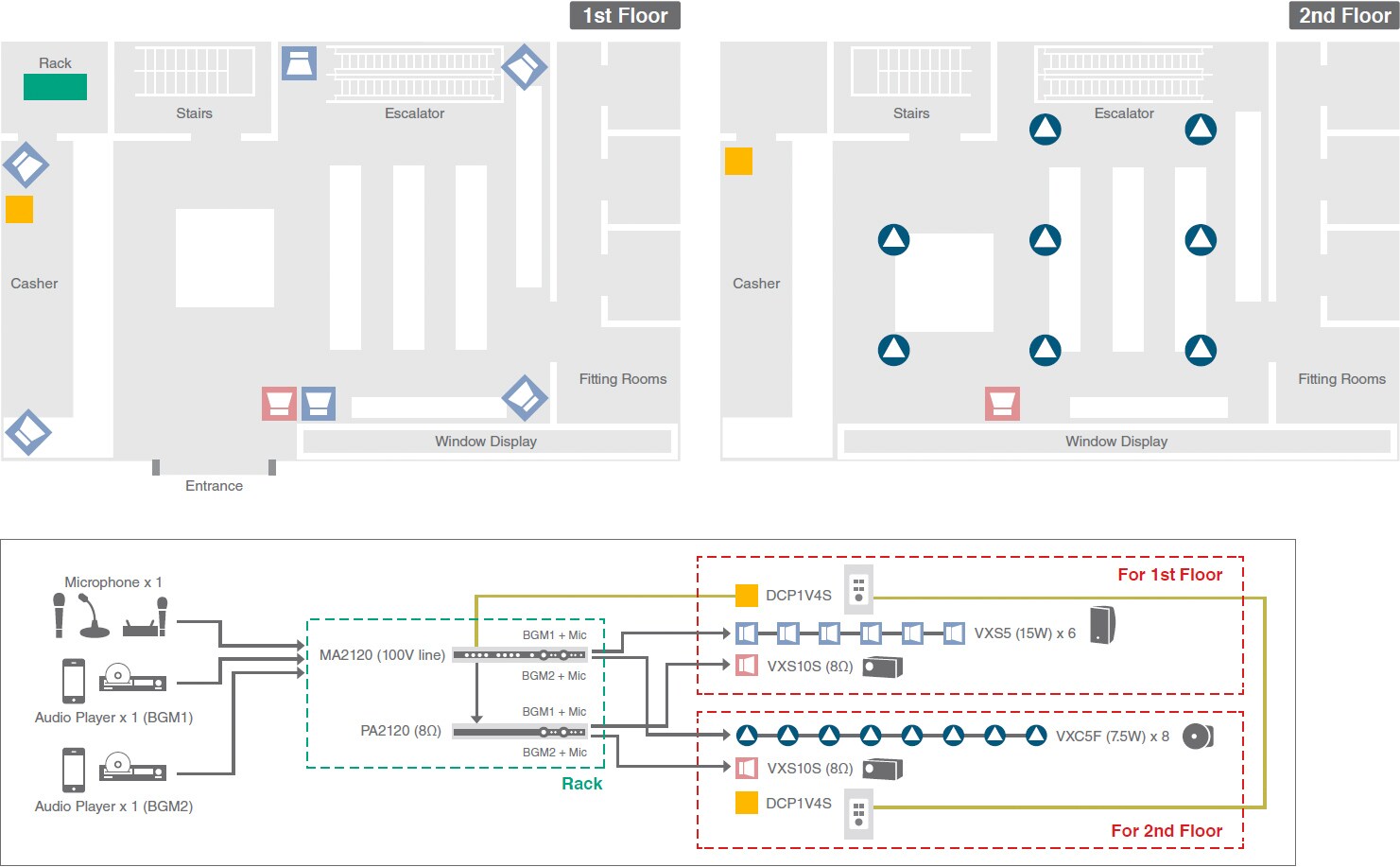 이 시스템은 바나 라운지를 갖춘 다층 매장이나 레스토랑용으로 선택하면 좋습니다. 배경음악은 특정 분위기 조성을 위해서 장식과 조명만큼 중요합니다. Yamaha VXS 및 VXC 시리즈 스피커는 청취 구역에 음악의 충분한 감정적 효과를 주는 고품질의 녹음 재생을 제공하여 전체적인 분위기에 크게 기여합니다. VXS10S 서브우퍼를 추가하여 리듬이 경쾌한 음악의 힘과 흥겨움을 높일 수 있습니다. MA2120은 여러 공간에 다른 배경음악을 공급하면서 안내방송 및 광고용으로 좋은 선택이 될 것입니다. 이것은 마이크를 사용하는 동안 배경음악의 볼륨을 자동으로 줄여주는 Ducker 기능이 있어서 수동 조절이 필요치 않습니다. 별도의 구역에 설치되는 DCP1V4S 제어판을 통해 배경음악 불륨과 기타 작동을 원격 제어할 수 있습니다.