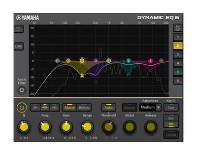 Dynamic EQ6는 6밴드 다이내믹 이퀄라이저로, 확장된 기능 세트가 포함되어 있으며 Static 게인과 다이내믹 레인지 컨트롤을 결합하고 이전 Yamaha Dynamic EQ 플러그인의 기능에 하이패스/로우패스 필터를 추가했습니다.