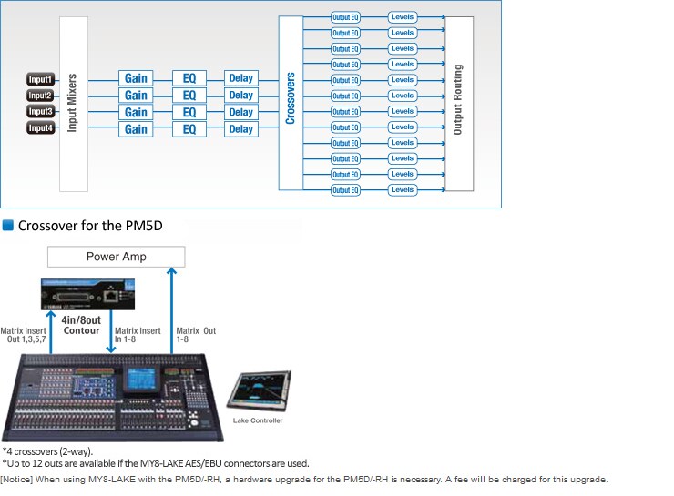 Lake 프로세싱은 라이브 사운드 영역 스피커 프로세싱의 실질적인 기준이 되었습니다. MY8-LAKE는 Yamaha 디지털 믹싱 콘솔 DSP 카드로 Yamaha와 Lake의 긴밀한 기술 협력을 통해 개발되었습니다. Mesa EQ 최고의 성능, Ideal Graphic EQ, Linear Phase Crossover 기능을 작은 카드 하나에 채워 엄청난 프로세싱 능력을 제공하며, 손가락 하나로 정밀하고 직관적인 제어가 가능합니다. ※Nexo 스피커 프리셋 관련 Nexo 라우드스피커는 Nexo TD 컨트롤러 전용으로 제작되었기 때문에 Lake 컨트롤러 라이브러리에 포함된 Nexo 프리셋을 MY8-LAKE와 함께 사용할 수 없습니다.