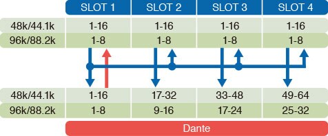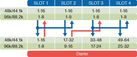 패턴 6: Dante 입력 1~16*을 슬롯 1과 2에 배치 / Dante 입력 17~32*를 슬롯 3과 4에 배치