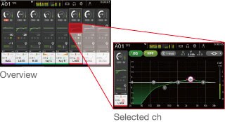 CL시리즈와 마찬가지로 조절은 Overview와 Selected Channel 윈도우를 기반으로 합니다. Overview 화면은 한 번에 8개 채널의 파라미터를 보여주며 Touch&Turn 노브를 사용하여 Gain, 1-knob EQTM, 1-knob COMPTM, GATE의 트레솔드 이펙터의 Send Level, Pan 등을 조정할 수 있습니다. 보다 자세한 컨트롤을 위해 파리미터를 조절할 때는 하이라이트 된 박스를 한 번 더 누르면 selected channel 화면이 표시됩니다.