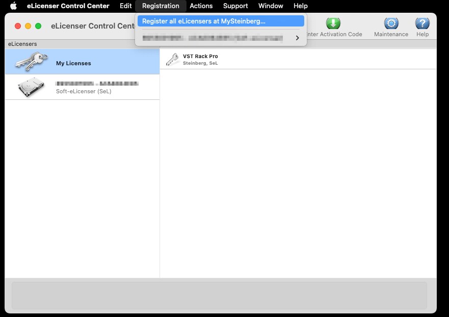 eLicenser Control Center 애플리케이션을 열고 Soft-eLicenser 또는 USB-eLicenser에 VST Rack Pro 라이선스가 표시되는지 확인합니다.