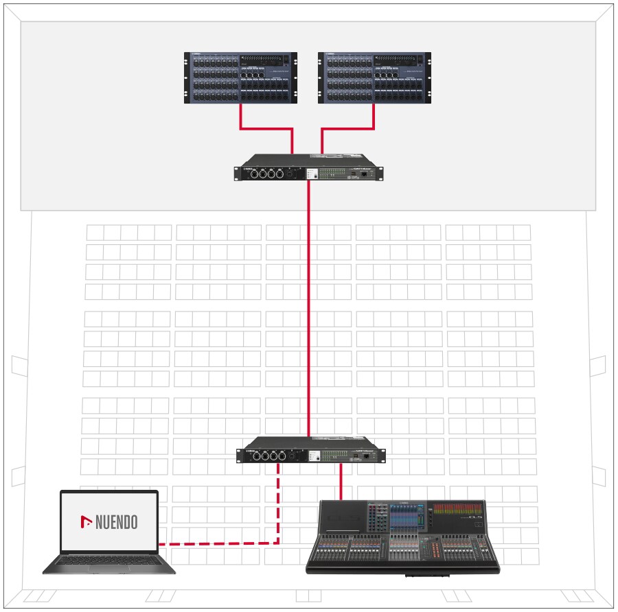Dante는 물리적 지점 간 연결을 설정하지 않고 논리적 라우팅을 사용하기 때문에 단 몇 번의 마우스 클릭만으로 사용 가능한 포트를 통해 네트워크를 구성할 수 있습니다.