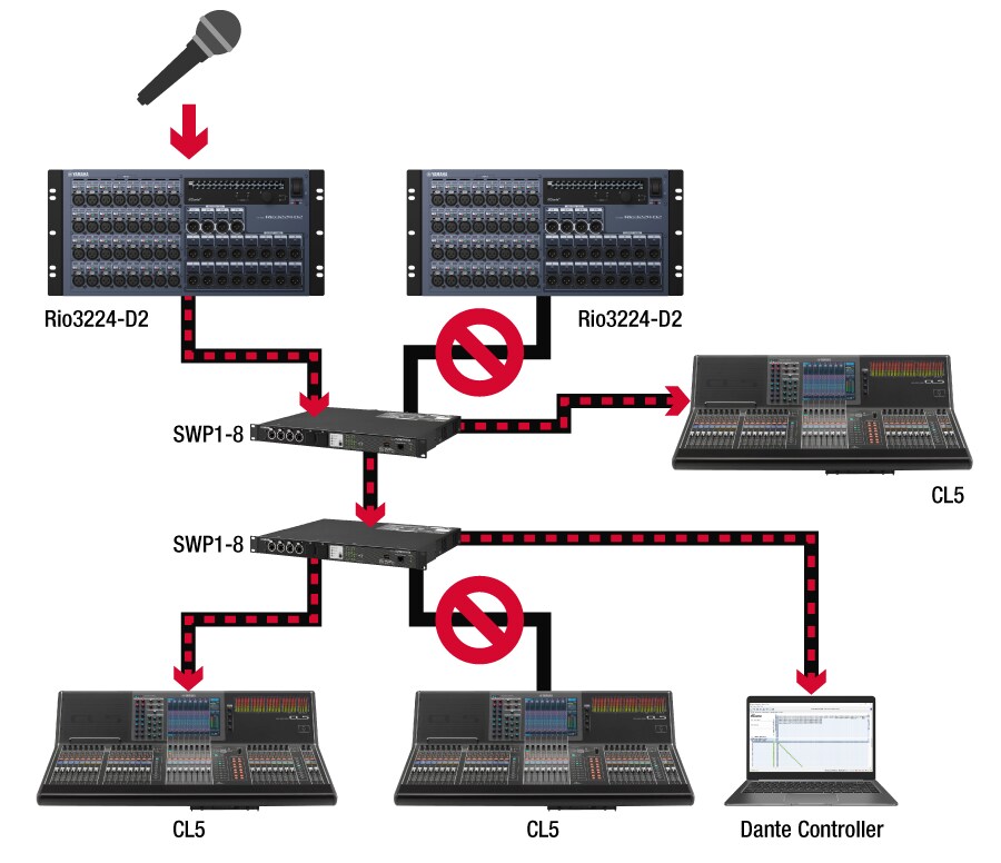 - -Dante(1000base-T) 대역폭은 100MHz이므로 CAT5e 이상의 케이블이 필요합니다.