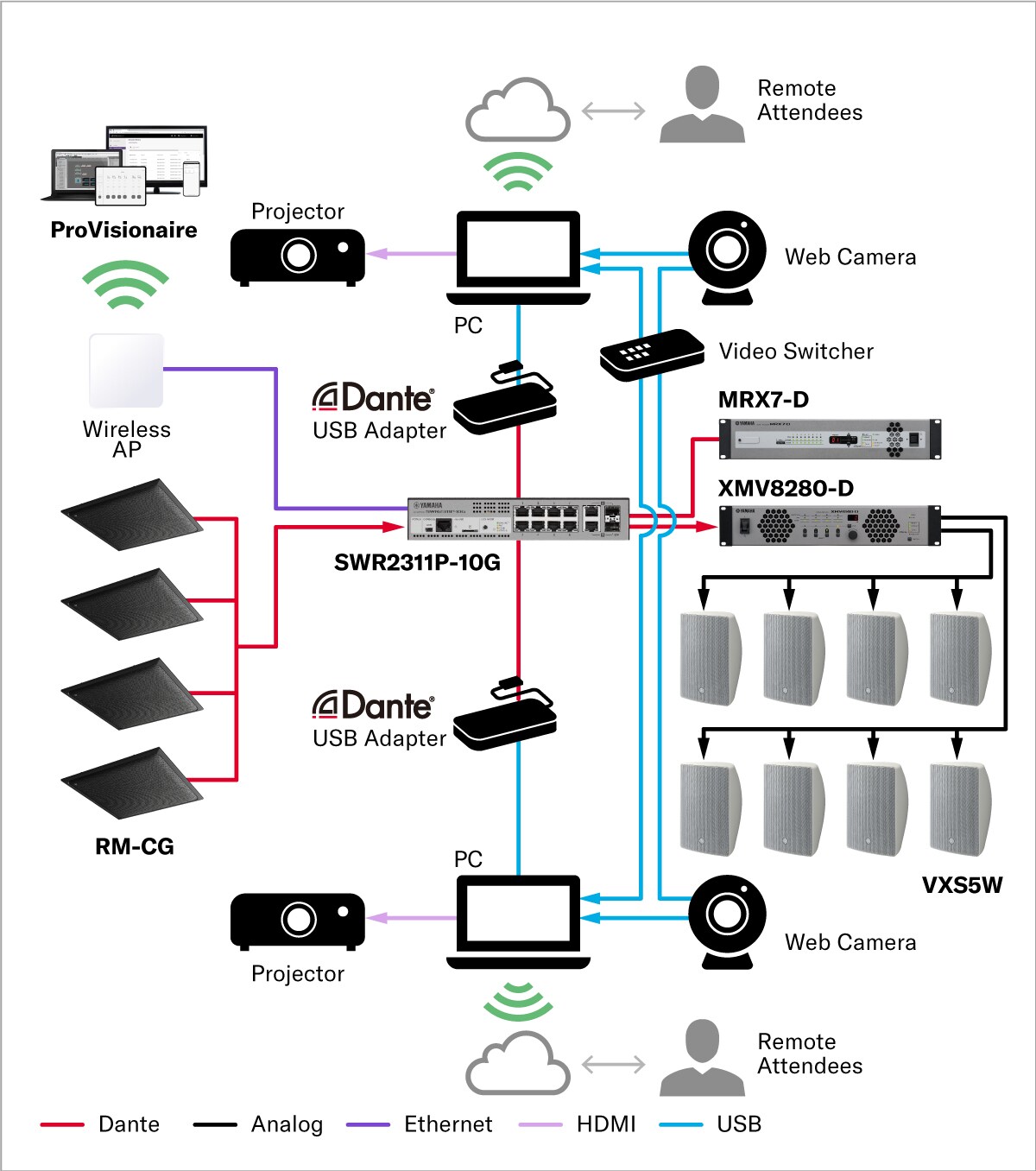야마하는 회의를 방해할 수 있는 피드백을 자동으로 억제하는 AEC(Acoustic Echo Canceller)와 여러 스피커의 볼륨을 자동으로 조정하고 원치 않는 노이즈를 제거하는 Auto Mixer와 같은 음성 관련 응용 프로그램에 이상적인 여러 시그널 처리 기능을 개발했습니다. 또한 당사의 ProVisionair 전용 소프트웨어는 시스템 매개 변수 및 구성의 원격 제어를 통해 사용자가 음성 관련 문제를 최소화하도록 도울 수 있습니다.