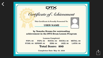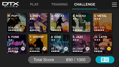 “Challenge Mode” is a new function on the DTX402 Touch that tests your skill. If you can play all 10 practice songs without making a mistake, you will receive a “Drummer’s Certificate” from the Yamaha DTX drum team that you can share via social media.