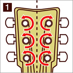 1. 기타에 현을 다시 매기 전에 먼저 줄감개를 돌릴 방향을 확인합니다. 1~3번 현의 줄감개는 보통 앞에서 봤을 때 시계 방향으로 돌리고, 4~6번 현은 반시계 방향으로 돌립니다.