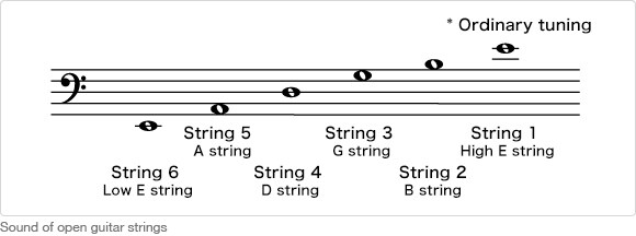 위에서 아래로 (두꺼운 현에서 얇은 현으로) 이동할수록 피치가 더 높아집니다. 아래 그림은 일반적인 튜닝을 나타내며, 왼손으로 누르지 않았을 때 각 현에서 만들어지는 음을 의미합니다.