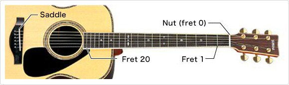 현이 짧아질수록 피치가 증가합니다. 기타는 이런 특징을 활용해 누르는 현의 위치가 바뀔 때마다 피치가 반음씩 증가하도록 설계되었습니다. 넥의 금속 부분은 프렛이라고 부릅니다. 연주자는 왼손을 사용해 프렛 사이 공간에서 현을 누릅니다. 반음 20개에 총 프렛 수가 20개입니다. 이는 6번 현으로 낮은 E에서 두 번째 옥타브 C까지 (약하게) 연주할 수 있음을 의미합니다. 그러나, 사운드 홀에 가까울수록 현을 누르기가 어렵기 때문에 이 부분은 잘 사용되지 않습니다.