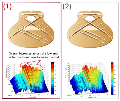야마하 R&D 부서에서 개발한 최첨단 어쿠스틱 분석 기술로 새로운 FG는 저음역대와 중음역대에서 크고 강력한 사운드를 제공합니다. 야마하 엔지니어가 전통이나 추측에 의존하지 않고 분석과 시뮬레이션을 통해 최고의 브레이싱을 설계한 결과 이러한 사운드가 탄생했습니다. 이 분석을 통해 상판의 내구성을 유지하는 이상적인 어쿠스틱 구조인 스캘럽드 브레이싱 패턴을 개발하였고, 그 결과로 야마하 FG는 최고의 사운드를 제공하게 되었습니다.