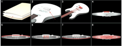 Yamaha의 오리지널 A. I. R.(Alternative Internal Resonance) 기술을 통해 RGXA2 및 RBX4A2는 음의 손실 없이 뛰어난 경량급 악기의 특성을 제공합니다. -바디 구성 : 하드 우드와 후면 보드 사이에 경량급 코어가 끼어 있습니다.(1) -브릿지 플레이트 아래에 설치된 3개의 메탈 튜브(사운드 튜브)는 현의 진동을 바디로 전달하고 바디의 진동을 브릿지로 보내줍니다.(2) -상판 보드는 브릿지를 통해 지나는 현의 진동에 빨리 응답합니다. 바디를 가로지르는 특수 사운드 튜브는 소재 내부에서 풍부한 레조넌스를 생성합니다. 후면 보드가 울리고, 공명이 전체 바디 구조에 전달되면서, 독특한 외관과 고유의 바디에 의해 전체적으로 강렬한 공명톤이 발생합니다.(3)-(8)