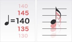 왼쪽: 박자 늘림, 오른쪽: 피치 이동 모든 노래의 범위가 동일한 것은 아닙니다. PSR-S950은 템포를 바꾸지 않고도 피치를 변경하는 강력한 기능이 있어 좋아하는 노래를 여러분이 선택한 키로 연주할 수 있습니다. 템포를 변경하고 싶은 경우, 시간 늘리기 기능을 사용해 피치를 바꾸지 않고 템포를 느리게 또는 빠르게 만들 수 있습니다.