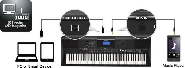 PSR-EW400에는 USB TO HOST 단자*를 통한 오디오 전송 기능이 있습니다. 컴퓨터나 스마트 기기에 자신의 연주를 녹음할 수 있습니다.
