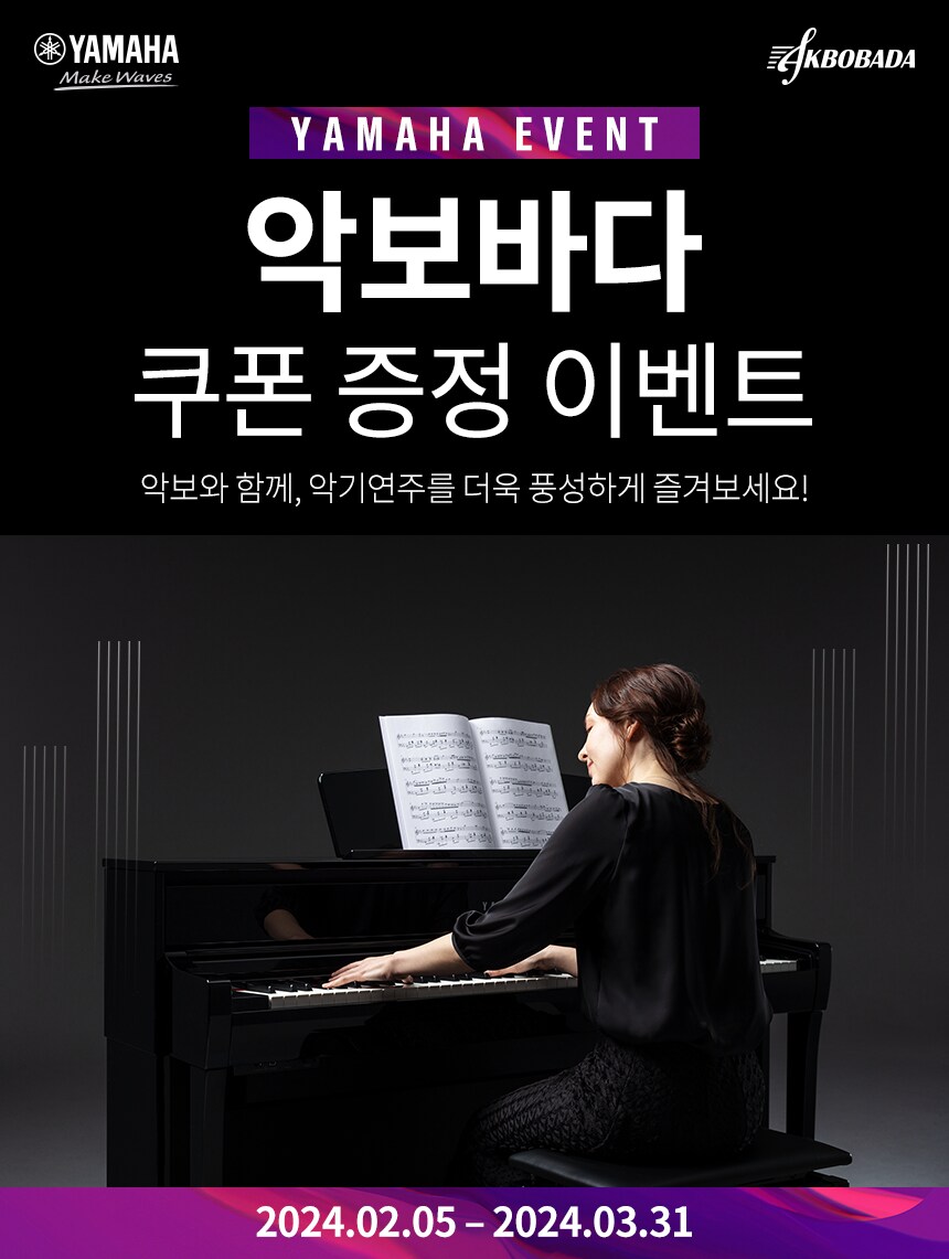오는 3월 31일까지 진행되는 이번 프로모션은 민족 대명절 설을 맞아 전국 야마하 직영점과 공식 온라인몰에서 악기를 20만 원 이상 구매한 고객에게 국내 최대 악보 사이트인 ‘악보바다 3만 원 쿠폰’을 증정한다. 발급된 쿠폰으로 클래식, 가요, 뉴에이지 등 다양한 장르의 악보를 구입할 수 있다.