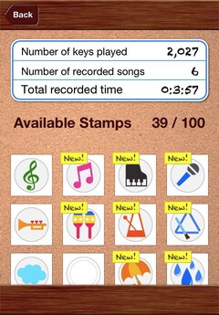 My Music Recorder으 스탬프 기능은 자녀의 연주 연습에 동기를 부여합니다. 오래 연습할수록 더 많은 스탬프를 모을 수 있습니다.