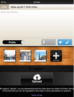 Piano Diary에서 MIDI 녹음을 오디오로 바꿀 수 있습니다. 선호하는 사진을 추가하면 Piano Diary에서 MIDI 연주가 오디오로 만들어져 나만의 독창적인 슬라이드 쇼가 탄생됩니다. 완성된 슬라이드 쇼를 YouTube에 업로드하면 친구와 가족이 여러분의 연주를 즐길 수 있습니다!