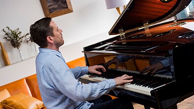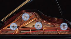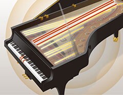 그랜드 피아노는 현과 소리가 악기 바디 전체에서 공명하면서 풍성한 잔향을 만들어 듣는 사람을 소리로 둘러쌉니다. 연주하는 현만 진동하는 것이 아니라 다른 현도 연주하는 현에 반응하여 함께 울립니다. 이것이 바로 피아노에서 매우 복합적이고 풍성한 소리가 나오는 이유 중 하나입니다.