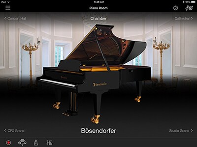 피아노 음색을 선택하는 것 외에도 Smart Pianist를 사용하여 그랜드피아노 뚜껑이 열리는 정도, 연주 장소의 반향 음향 및 피아노 음향에 영향을 주는 기타 요인으로 인한 잔향과 같은 매개 변수를 조정할 수 있습니다.