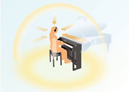 야마하의 첨단 Binaural Sampling 기술이 Clavinova에 최초로 사용되었습니다. 이 기술은 호평을 받고 있는 야마하의 콘서트그랜드피아노 CFX의 샘플을 사용하며, 이들 샘플은 위치 정보와 인간의 귀로는 구별되지 않는 각종 뉘앙스를 포착하는 특수 마이크로 녹음한 것입니다. 그 결과, 매우 자연스러운 서라운드 사운드가 만들어져서 헤드폰을 끼고 있다는 것조차 잊게 됩니다.