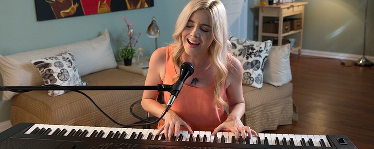 Yamaha 건반은 다양한 기능으로 유명합니다. 이제 마이크를 연결해서 연주하는 동안 악기의 스피커를 통해 나오는 디지털 이펙트의 음색을 듣고 따라서 부를 수 있습니다. 게다가 연주를 USB 장치에 녹음해서 친구나 가족과 공유할 수도 있습니다.
