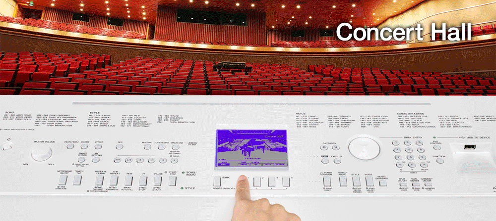 여러분만의 공간인 ""Piano Room""에 오신 것을 환영합니다! DGX-660은 다양한 피아노 및 어쿠스틱 설정을 선택할 가상의 장소를 제시해 줌으로써, 자신만의 연습이나 연주 환경을 만들어 줍니다. 원하는 피아노를 간편하게 선택한 후, 일반 공간, 클럽 무대, 콘서트 홀 등의 어쿠스틱 공간을 선택합니다. 가상으로 피아노 뚜껑의 위치까지도 조절할 수 있답니다!