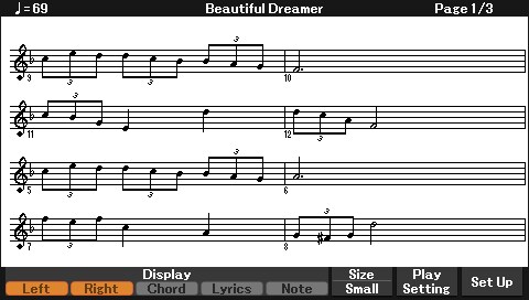 레슨 기능은 디스플레이에 악보가 표시되어 노래를 배우고 마스터하는 재미있는 방법입니다. 예를 들어, 오른손 파트를 연습할 때 왼손 파트와 다른 파트의 재생은 연주자가 음을 올바르게 연주할 때까지 기다리게 됩니다. 이를 통해 초보자라도 멜로디와 프레이즈를 부드럽게 연습할 수 있습니다.