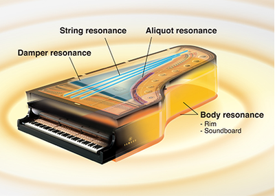 그랜드 피아노 내에서 사운드는 악기의 몸체 전체를 통해 공명하여 풍부한 반향을 만들어 내어 듣는이를 사운드로 에워쌉니다. 이러한 현상은 향상된 가상 공명 모델링(VRM)을 통해 완벽히 재현됩니다. 이 독창적인 VRM은 건반의 88개 각 음조에 대해 현의 다양한 상태, 한 순간에서 다음 순간까지 그리고 댐퍼(감쇠기) 페달의 눌린 시간과 깊이를 계산합니다. 향상된 VRM은 이제 상위 옥타브에서 나뉜 공명과 사운드보드, 림, 프레임의 전체 공명도 계산합니다. 이 기술을 통해 피아노 연주에 내재된 무수한 요인을 반영하는 생생하고 밝으며 다양성이 풍부한 표현을 할 수 있습니다