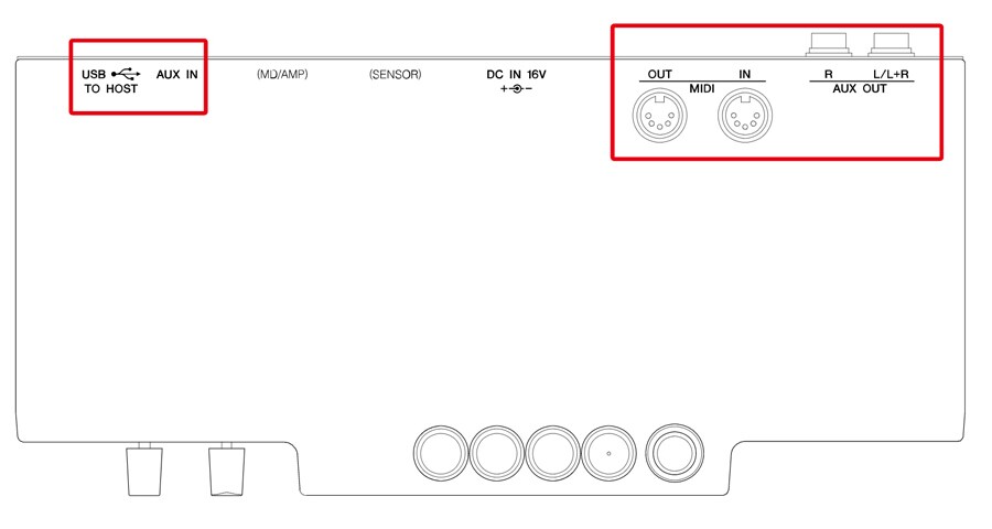 USB TO HOST 단자를 이용하면 별도의 인터페이스가 필요 없이 컴퓨터나 휴대용 기기에 연결하고 고품질의 오디오를 녹음할 수 있으며, AUX OUT 단자를 사용하면 다양한 외부 장치(예: 스테레오 컴포넌트, IC 레코더, 내장형 앰프를 갖춘 스피커, 스테레오 시스템)에 사운드를 출력할 수 있고, AUX IN 단자를 이용해서는 외부 장치(음원 모듈 및 음악 플레이어)에서 사운드를 들을 수 있습니다. MIDI OUTPUT 단자는 연주 정보를 신디사이저와 같은 외부 장치에 전송합니다. MIDI IN 단자는 TransAcoustic™ TA2의 음 발생기를 사용하여 악기가 시퀀서로부터 연주 정보를 받아 재생할 수 있습니다.