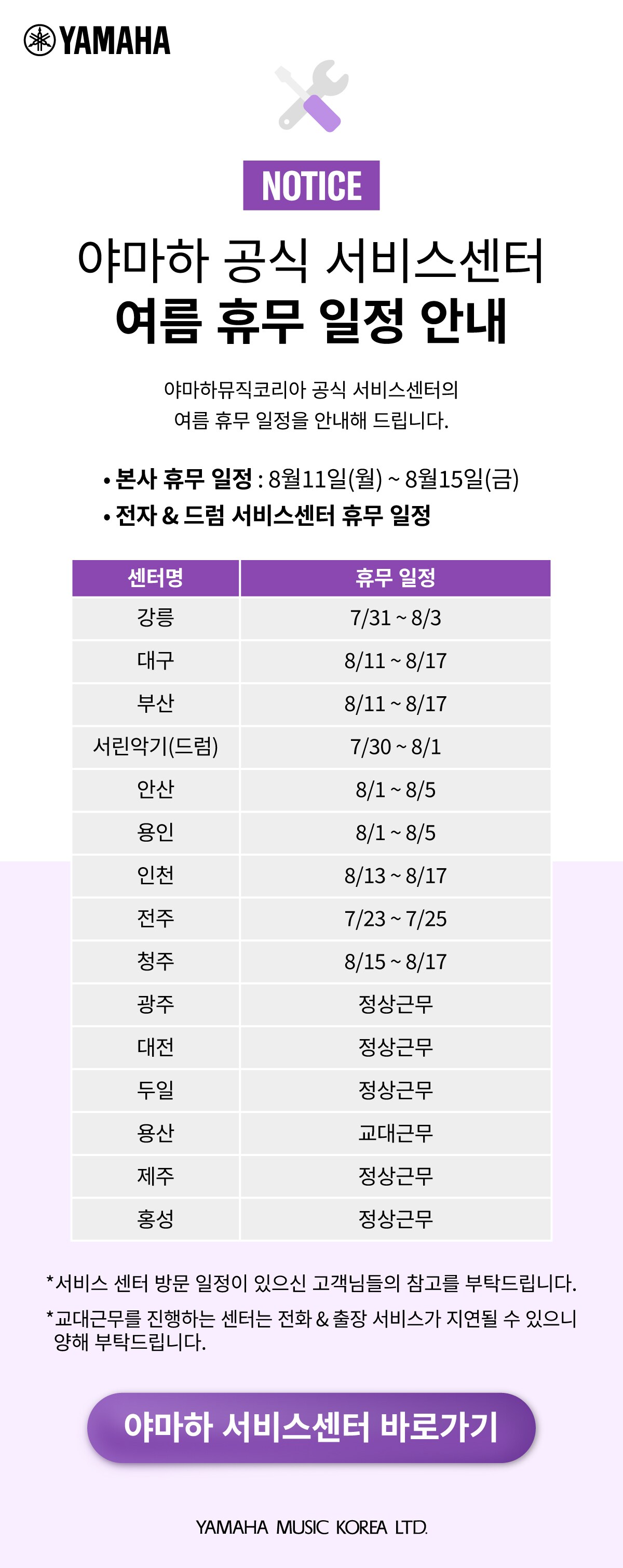 야마하 공식 서비스센터 여름 휴무 일정 안내
