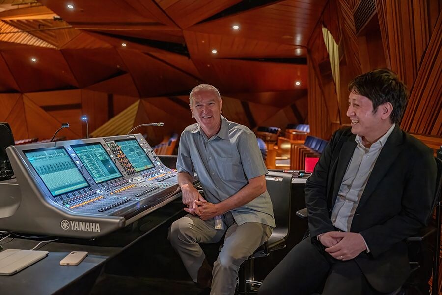 예술 센터 음향 책임자와 Yamaha Music Gulf FZE의 Kazuya Yoshimura, 그리고 RIVAGE PM5 컨트롤 서피스