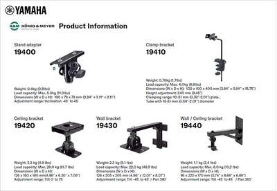 1949년에 설립된 König & Meyer는 마이크, 스피커, 악기용 스탠드를 제조하는 세계적인 선두주자로, 야마하 장비와 완벽하게 호환되는 고품질, 내구성 있는 브라켓 및 스탠드 하드웨어를 제공합니다.